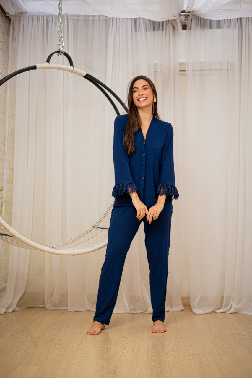 Descubra a sofisticação do Pijama Longo Eternal Azul, a peça ideal para suas noites de autocuidado e momentos especiais. Confeccionado em malha com toque suave, este pijama oferece conforto e elegância em cada detalhe.
